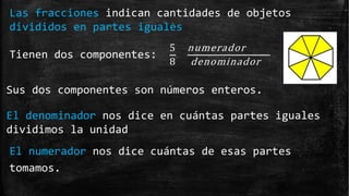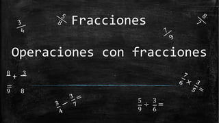 Este documento trata sobre las operaciones con fracciones. Explica los componentes de las fracciones (numerador y denominador), cómo comparar y realizar las cuatro operaciones básicas con ellas. Para sumar y restar fracciones, deben tener el mismo denominador o convertirse a fracciones equivalentes con el mismo denominador. Para multiplicar y dividir no es necesario, se realizan directamente las operaciones con los numeradores y denominadores.