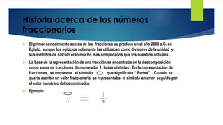 El documento describe la historia y conceptos básicos de las fracciones. Los egipcios fueron los primeros en usar fracciones en el 2000 a.C., representándolas como sumas de fracciones unitarias. Una fracción representa una parte de un todo y consta de un numerador y un denominador. Existen diferentes tipos de fracciones como las de términos enteros y las operaciones básicas con ellas como suma, resta, multiplicación y división.