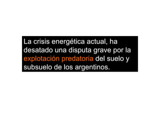 Este documento describe los posibles impactos negativos de la fractura hidráulica para la extracción de gas de esquisto, incluyendo la contaminación del agua y el aire, el gran consumo de agua, y los riesgos para la salud humana. Se promueve principalmente para beneficiar a grandes compañías transnacionales y no para abastecer el mercado interno argentino. El documento concluye rechazando este modelo extractivo no convencional debido a los daños que causa al medio ambiente y los ecosistemas.