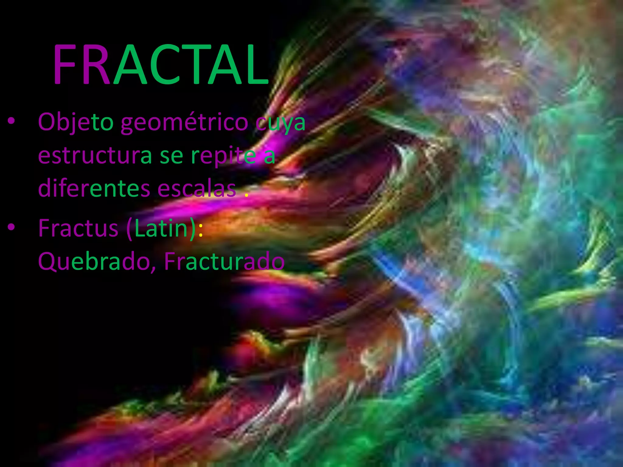 El documento habla sobre fractales, objetos geométricos cuya estructura se repite a diferentes escalas, como su nombre "fractus" en latín indica, y menciona la simetría reflexional y forma bisetada como características de los fractales, dando ejemplos de imágenes como ilustración.