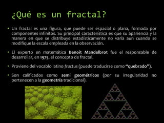 Los fractales son figuras formadas por componentes infinitos que mantienen su apariencia en distintas escalas, desarrolladas por Benoît Mandelbrot en 1975. Tienen aplicaciones en áreas como comunicaciones, biología, matemáticas, y economía, entre otras. Existen diversas herramientas de software para crear y analizar fractales, incluyendo Turtle Graphics, ChaosPro y GIMP.