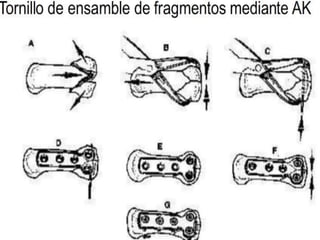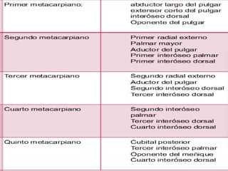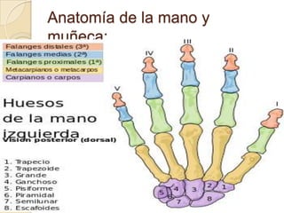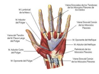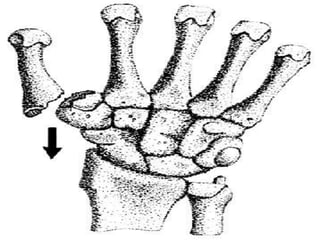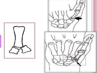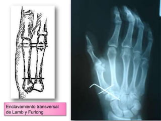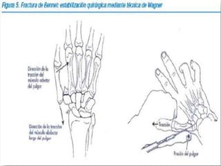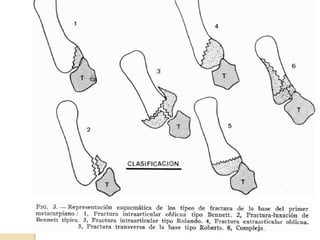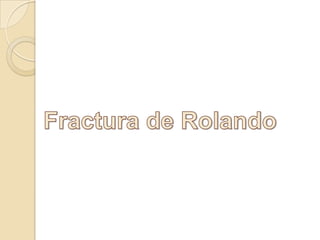 La fractura de Bennett es una fractura oblicua intra-articular de la base del primer metacarpiano que causa luxación del fragmento distal. Su tratamiento puede ser cerrado o quirúrgico dependiendo del tamaño del fragmento. La fractura de Rolando es similar pero con mayor conminación en forma de "Y" o "T", requiriendo reducción quirúrgica y osteosíntesis. El tratamiento fisioterapéutico busca estabilidad, ausencia de dolor y movilidad para evitar complicaciones como pseudoartrosis o rigidez.