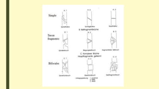 Este documento define una fractura ósea y describe las diferentes clasificaciones de fracturas según su gravedad, energía causante, localización anatómica y características. Explica los tipos de fracturas cerradas y abiertas, las condiciones necesarias para la consolidación ósea, y los factores que afectan la incidencia de fracturas como la edad y el sexo.