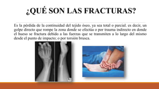 Este documento habla sobre las fracturas óseas, definiéndolas como la pérdida de la continuidad del tejido óseo. Explica que pueden ser causadas por golpes directos o indirectos y describe los tipos de fracturas y sus síntomas. Además, detalla el proceso de curación ósea y las condiciones necesarias para que ocurra, como la viabilidad de los huesos y el contacto entre los extremos fracturados. Por último, proporciona recomendaciones sobre el tratamiento de primeros auxilios para diferentes fract