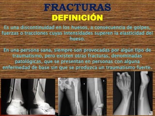 Este documento presenta información sobre fracturas óseas. Define una fractura, describe sus causas comunes y tipos incluyendo fracturas cerradas, abiertas y según su localización y trazo. Explica los síntomas, diagnóstico y complicaciones posibles. Finalmente, detalla reglas y métodos para inmovilizar fracturas en diferentes partes del cuerpo como brazo, antebrazo, muñeca, pierna y más.