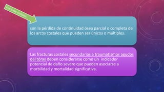 Las fracturas costales son más frecuentes en adultos jóvenes debido a agresiones físicas y accidentes de tránsito. Se sospecha clínicamente por dolor torácico, disnea y crepitación. El tratamiento incluye inmovilización, analgesia y en casos graves cirugía para tratar lesiones asociadas.