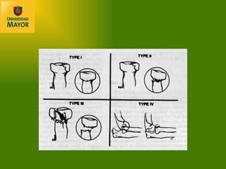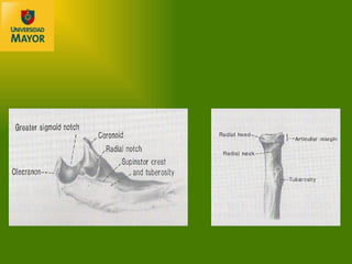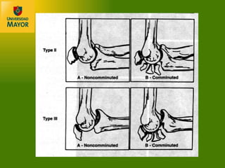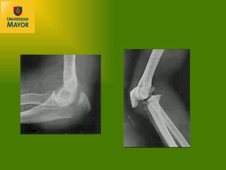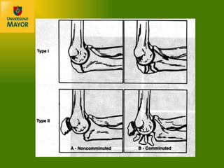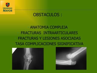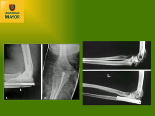 El documento describe las fracturas más comunes del codo y antebrazo, incluyendo fracturas del olecranon, cúpula radial y antebrazo. Explica la anatomía compleja de la región del codo y las complicaciones asociadas con las fracturas. También discute los avances en tratamiento como mejoras en imagenología, técnicas quirúrgicas e implantes que han llevado a una mayor movilización temprana y rehabilitación.
