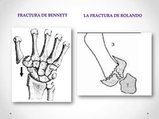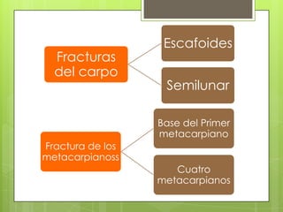 Este documento describe diferentes tipos de fracturas en la mano, incluyendo fracturas del carpo como el escafoides, fracturas de los metacarpianos como la base del primer metacarpiano, y fracturas de las falanges. Explica la anatomía de la mano, mecanismos de lesión, cuadros clínicos, órdenes radiológicas, tratamientos y posibles complicaciones.