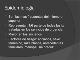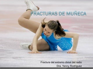 Este documento describe la fractura del extremo distal del radio, incluyendo su epidemiología, anatomía, mecanismos de lesión, evaluación clínica y por imagen, clasificaciones y opciones de tratamiento. Las fracturas del radio distal son comunes y ocurren con mayor frecuencia en ancianos. Se clasifican según su desplazamiento, angulación y afectación articular. El tratamiento depende de los factores de clasificación y puede incluir yeso, agujas percutáneas, placas u osteosíntesis externa.