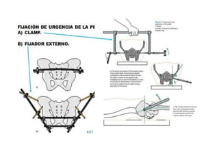 Las fracturas de pelvis pueden ser causadas por baja o alta energía y clasificarse como estables o inestables. Comúnmente afectan a personas entre 15-35 años y pueden causar lesiones asociadas como hemorragia, lesiones de órganos internos o fracturas de columna. El tratamiento depende de la clasificación y estabilidad de la fractura, pudiendo requerir reposo, fijación quirúrgica temporal o definitiva, y control radiográfico posterior.