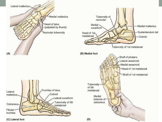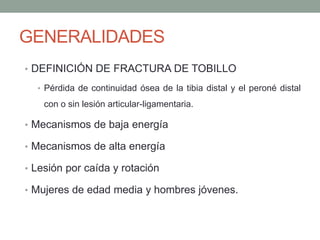 Este documento describe las fracturas de tobillo, incluyendo su definición, mecanismos, evaluación, clasificaciones, hallazgos radiográficos, tratamiento y otras lesiones asociadas como fracturas del pie, astrágalo y metatarso. Proporciona detalles sobre los tipos de fracturas, sus características y opciones de manejo quirúrgico o conservador.