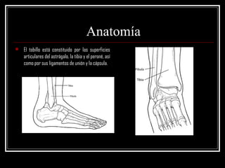 El documento presenta una exposición sobre fracturas de tobillo, abordando su anatomía, clasificación y tratamiento. Se describen diferentes clasificaciones de fracturas como Dupuytren-Danis, Lauge-Hansen y Danis-Weber, junto con sus características y tipos. Además, se discuten criterios y opciones de tratamiento para optimizar la recuperación del paciente.