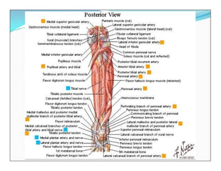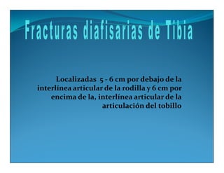 Este documento resume información sobre fracturas diafisiarias de la tibia, incluyendo su anatomía, mecanismos de lesión, clasificación, evaluación, tratamiento ortopédico y quirúrgico, y complicaciones. Describe la vascularización de la tibia y factores importantes en el diagnóstico y pronóstico de estas fracturas.
