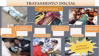 Las fracturas expuestas involucran una lesión de los huesos y partes blandas que comunican la fractura con el exterior. Suelen ser causadas por accidentes de tránsito o de trabajo, y exigen limpieza quirúrgica y fijación ósea para prevenir infecciones. El sistema de clasificación de Gustilo estratifica las fracturas expuestas en tres grados según la gravedad de la lesión de los tejidos blandos, guiando el tratamiento más adecuado.
