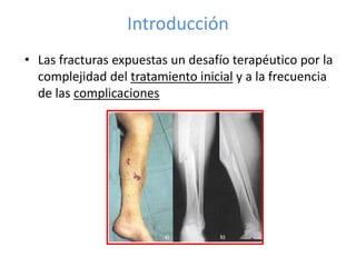 Este documento describe fracturas expuestas y su tratamiento. En 3 oraciones: