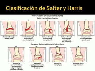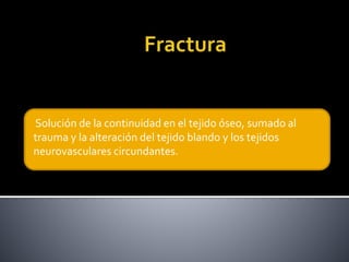 Este documento describe las características clínicas de las fracturas óseas. En menos de 3 oraciones, resume que las fracturas se producen por la interrupción del tejido óseo debido a un trauma, y que su diagnóstico se basa en la exploración clínica que incluye dolor, limitación funcional, crepitación y deformidad, así como exámenes de imagen como las radiografías.