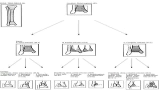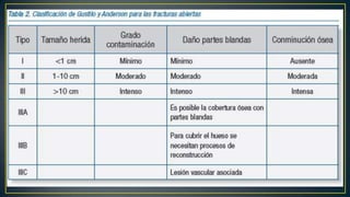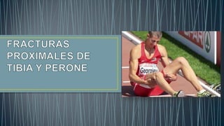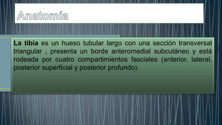 El documento resume la anatomía, irrigación sanguínea y nerviosa de la tibia y el peroné. Describe los tipos más comunes de fracturas en estos huesos, incluyendo las clasificaciones utilizadas. Resalta la importancia de evaluar posibles lesiones asociadas y el estado de los vasos sanguíneos y nervios durante el tratamiento de fracturas.