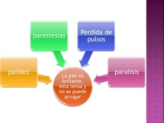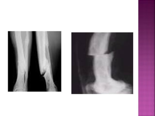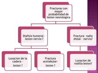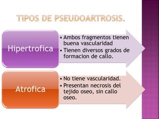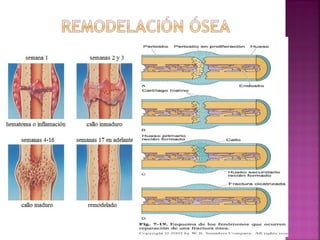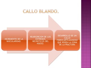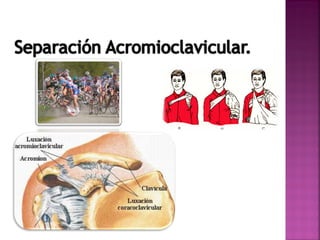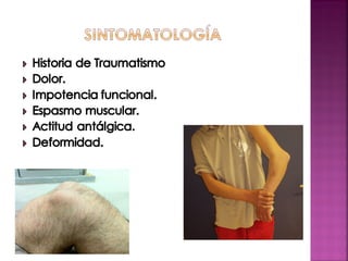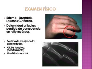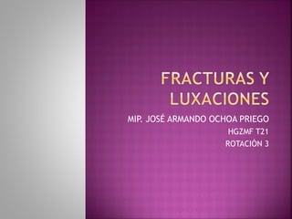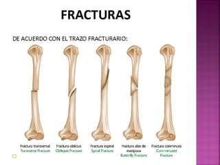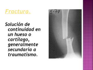 El documento describe diferentes tipos de fracturas y luxaciones óseas, sus causas, clasificaciones, mecanismos de curación y posibles complicaciones. Define fractura como una solución de continuidad en un hueso y luxación como el desplazamiento de los extremos óseos de una articulación. Explica las distintas etapas del proceso de curación de fracturas y posibles causas de falta de consolidación.