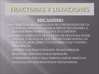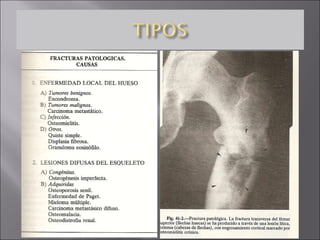 Este documento describe los diferentes tipos de fracturas óseas, incluyendo las causas, características y complicaciones potenciales. Explica que una fractura es la ruptura de un hueso o cartílago, generalmente debido a un traumatismo. Describe las diferentes formas de fracturas (por tensión, rotación, compresión, etc.) y los tipos (cerrada, abierta, incompleta). También cubre el proceso de consolidación de fracturas y posibles complicaciones como infección, lesión vascular, embolismo graso, mala unión