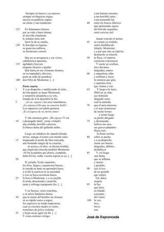 El documento narra la historia de Don Félix de Montemar, un estudiante arrogante y temerario de Salamanca. Una noche, después de cometer un crimen, Montemar se encuentra con fantasmas que lo atormentan por sus acciones pasadas. A pesar del terror, Montemar enfrenta valientemente a los fantasmas hasta que finalmente se desmaya, vencido por el cansancio físico y mental.
