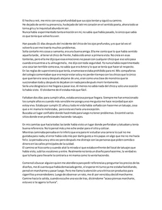 Este largo documento narra la historia de una joven de 20 años que experimenta amor a primera vista por un extraño que ve en la calle. Aunque al principio duda de sus sentimientos y cree que olvidará al chico, vuelve a encontrárselo 15 días después cuando va a un estudio de tatuajes cercano a su casa. Al escuchar su voz reconociéndola, la joven siente una gran emoción y nerviosismo, preguntándose qué le está pasando.