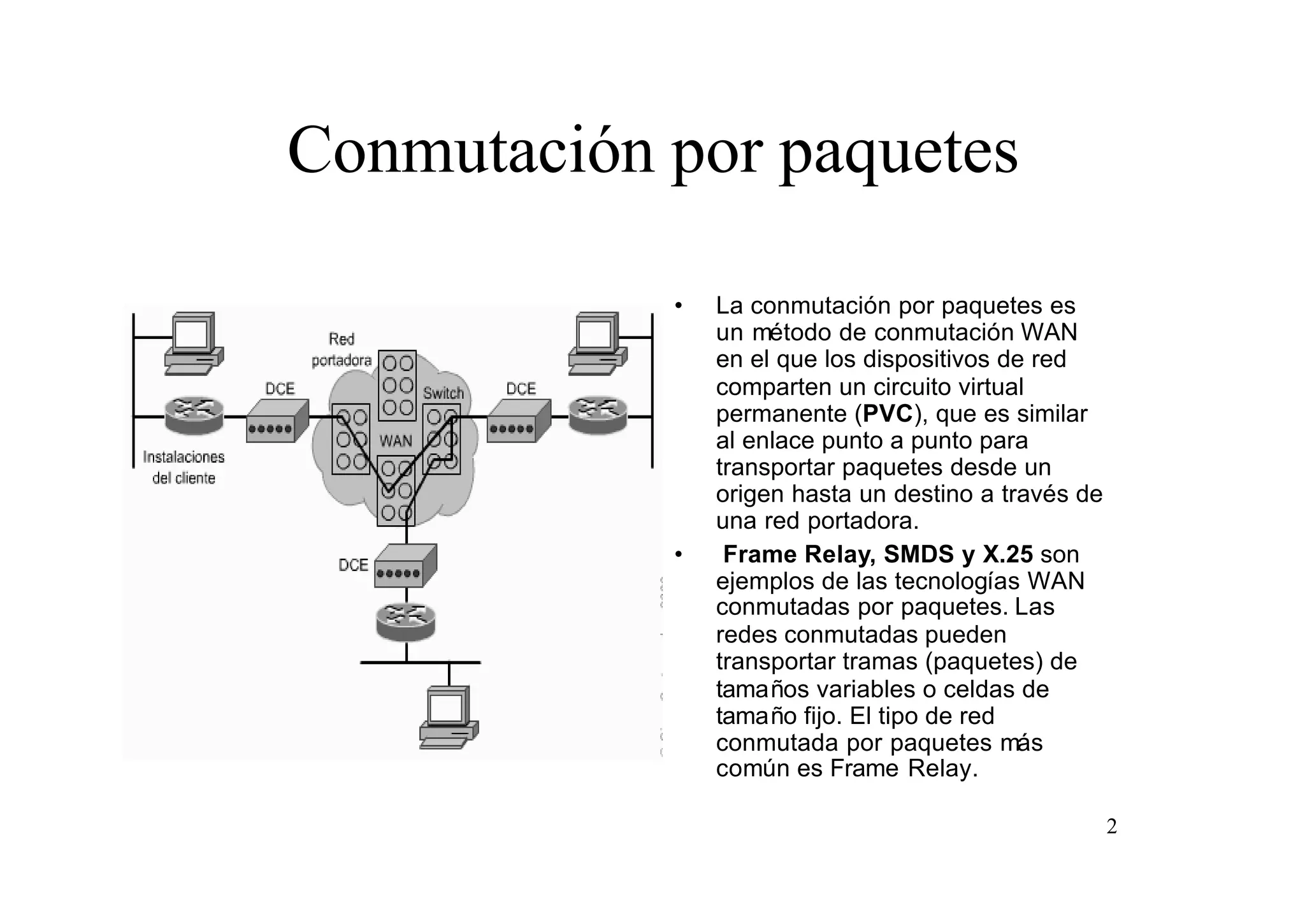 Frame Relay es una tecnología de red WAN que utiliza conmutación por paquetes y circuitos virtuales permanentes para transportar datos a través de una red. Proporciona un servicio no fiable y permite el uso compartido del ancho de banda de manera más eficiente que otras tecnologías como X.25. Frame Relay define mecanismos como DLCI, LMI y bits de control de congestión para dirigir el tráfico a través de la red y notificar sobre problemas de congestión.