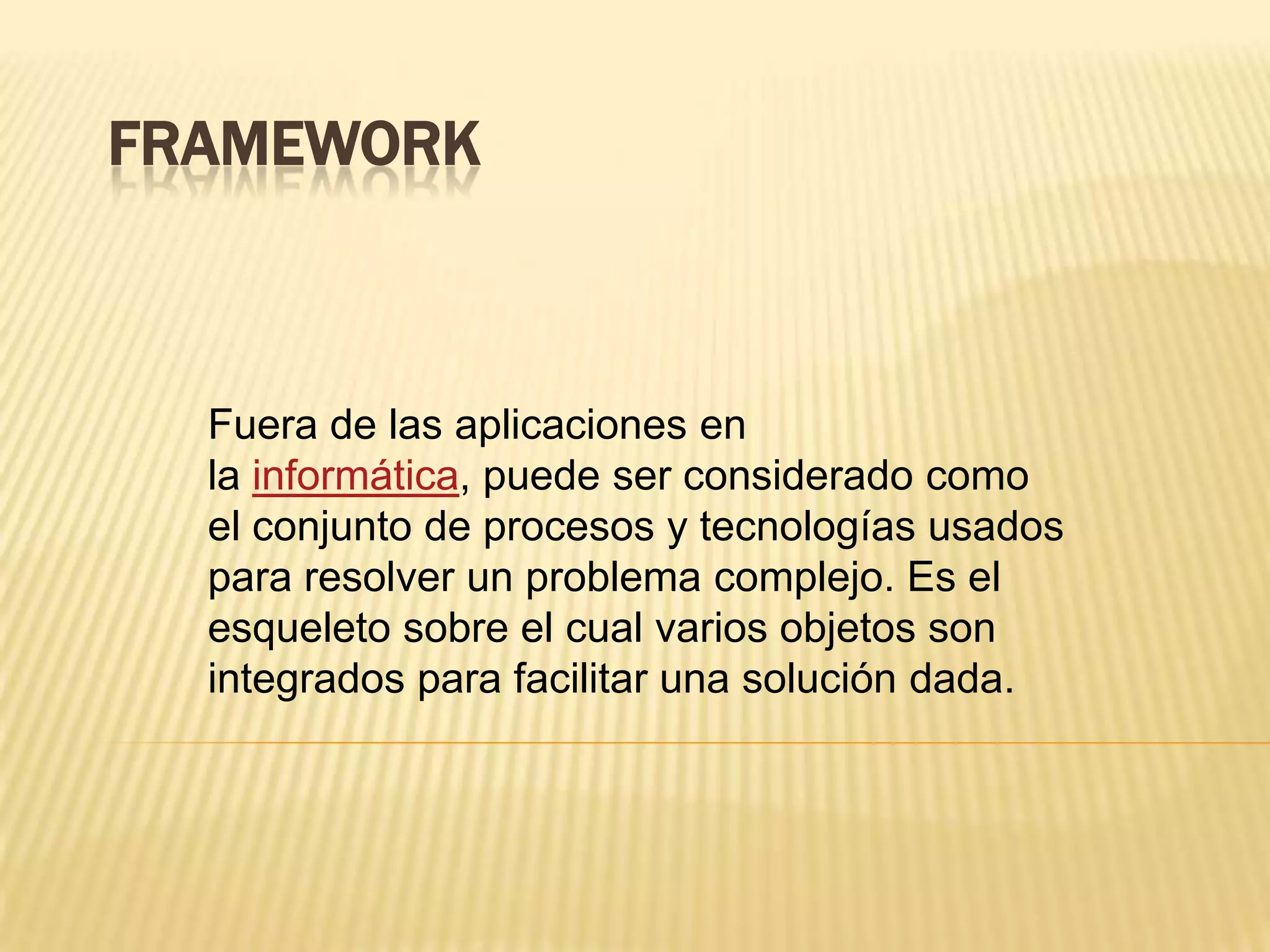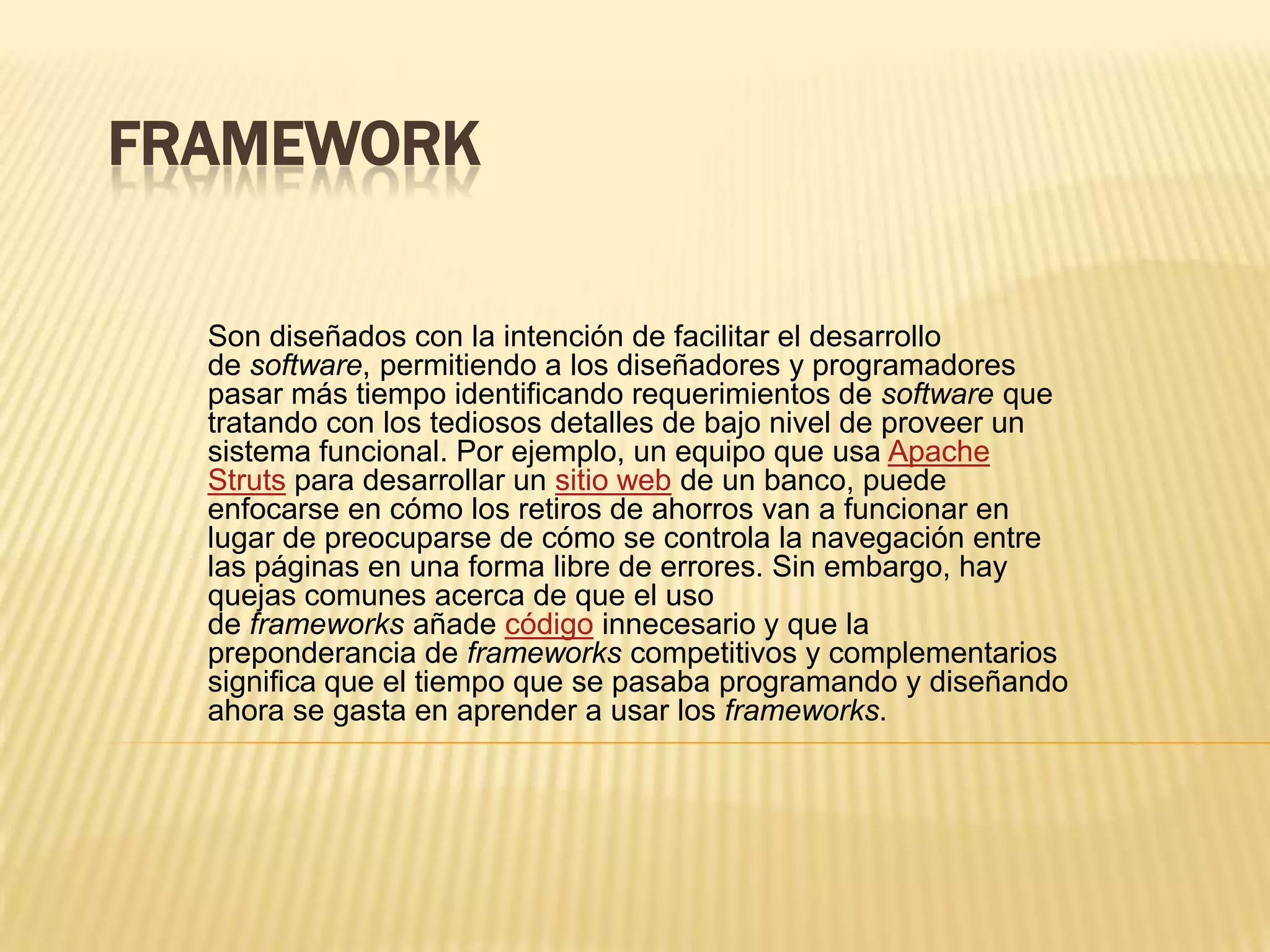 El documento describe los conceptos de frameworks y arquitectura MVC. Explica que los frameworks permiten a los desarrolladores enfocarse en los requerimientos del software en lugar de detalles técnicos. Describe los componentes clave de MVC: el modelo maneja la lógica y datos, la vista muestra la interfaz, y el controlador controla el flujo entre ellos. También provee ejemplos de código para implementar una aplicación web simple usando este patrón MVC.