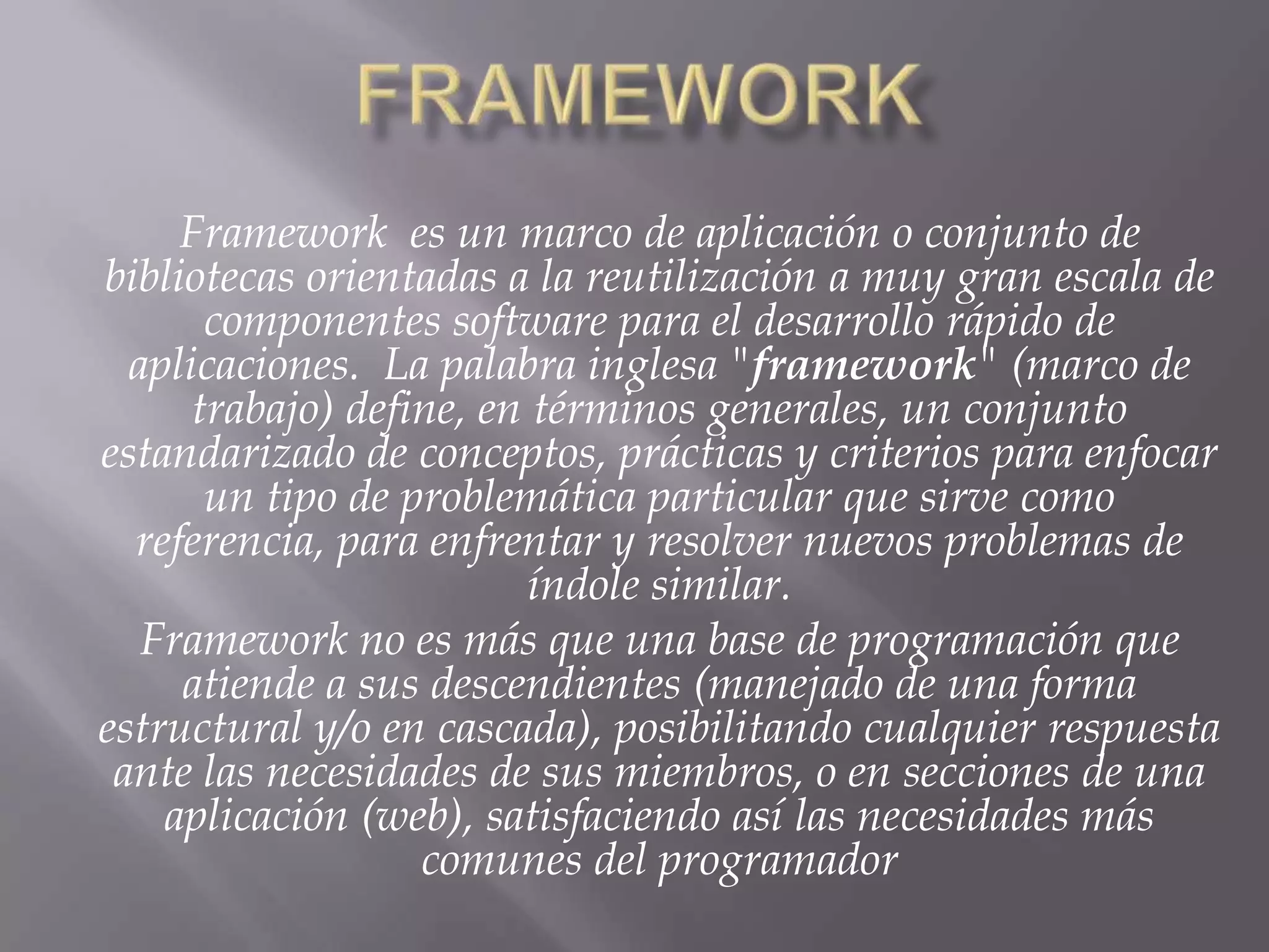 Un framework es un conjunto de bibliotecas y herramientas de software que sirven como base para el desarrollo rápido de aplicaciones mediante la reutilización de componentes. Los frameworks facilitan el desarrollo de software al liberar a los programadores de las tareas de bajo nivel y permitir la reutilización de componentes a gran escala siguiendo una estructura y metodología de trabajo común.