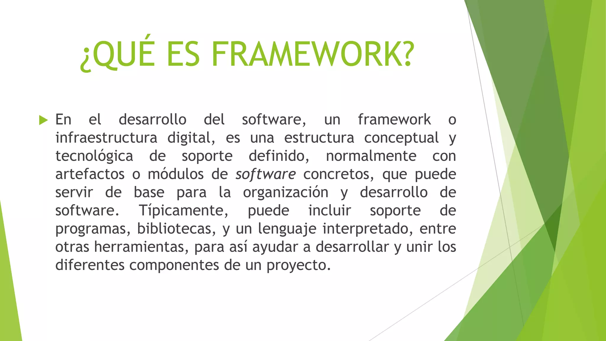 El documento describe qué es un framework y sus componentes clave. Un framework es una estructura conceptual y tecnológica que sirve de base para el desarrollo de software. Se compone típicamente de soporte de programas, bibliotecas y un lenguaje interpretado. Un framework facilita el desarrollo de software mediante la identificación de requisitos y proporcionando una arquitectura MVC (modelo-vista-controlador).