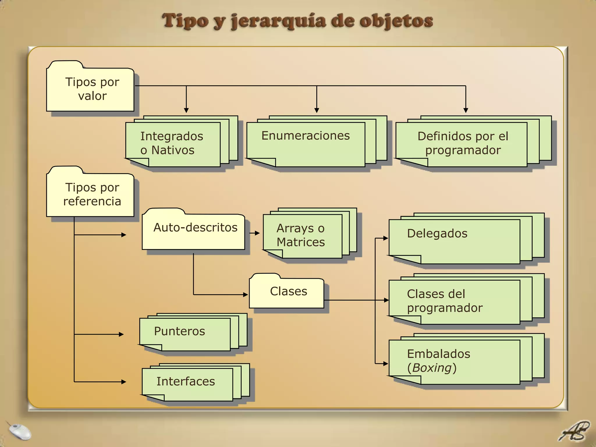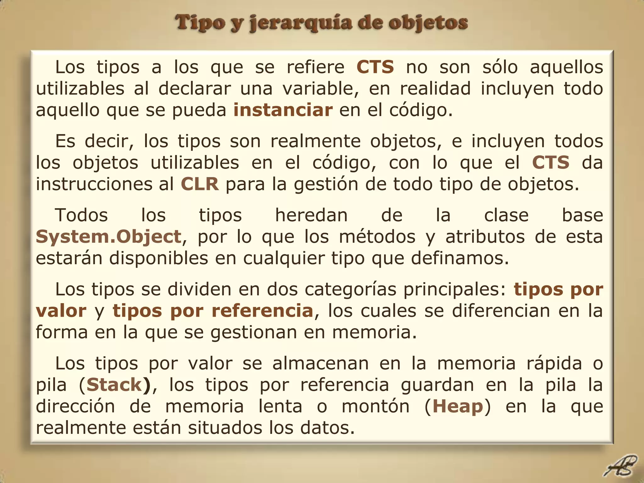 El documento describe los tipos de objetos en .NET, incluyendo tipos por valor y referencia, así como estructuras, enumeraciones, cadenas y StringBuilder. Los tipos incluyen datos integrados como enteros y cadenas, así como tipos definidos por el usuario como clases y estructuras. Los tipos por valor se almacenan en la pila mientras que los tipos por referencia almacenan direcciones de memoria en la pila y los datos en el montón.