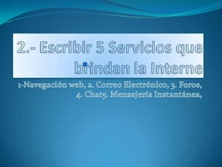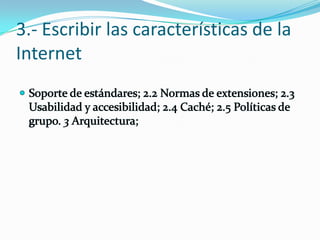 El documento lista 5 servicios principales de Internet como la navegación web, correo electrónico, foros, chat y mensajería instantánea. También describe características técnicas de Internet como estándares, extensiones, usabilidad y caché. Finalmente, explica que aunque la palabra "Internet" proviene del inglés, en español debería decirse "la Internet" ya que la palabra "red" a la que se refiere es femenina.
