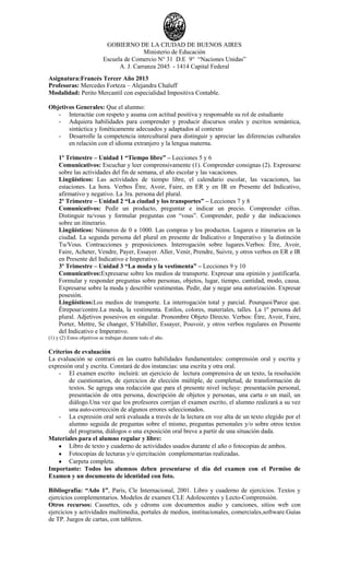 El documento presenta el plan de estudios anual de francés para tercer año de la Escuela de Comercio N° 31 en Buenos Aires. El plan describe tres unidades que se enseñarán durante el año sobre el tiempo libre, la ciudad y los transportes, y la moda. Cada unidad incluye objetivos comunicativos y lingüísticos, así como verbos y estructuras gramaticales que los estudiantes aprenderán. El documento también explica los criterios de evaluación, que incluirán exámenes escritos y orales, y los materiales que los estudiant