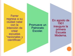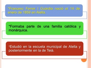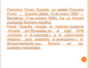 Francesc Ferrer i Guàrdia fue un pedagogo libertario español nacido en 1859 que promovió la educación laica y racionalista. En 1901 fundó la Escuela Moderna en Barcelona para aplicar sus ideas pedagógicas anarquistas, pero fue perseguido por sectores conservadores. En 1909 fue falsamente acusado de instigar disturbios y ejecutado, convirtiéndose en un mártir de la causa anarquista y libertaria.