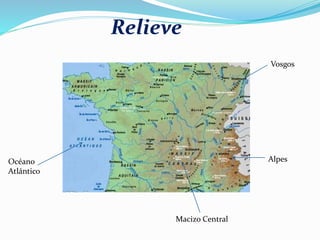 Francia tiene fronteras con Bélgica, Luxemburgo, Alemania, Suiza e Italia al este y España al suroeste. Su relieve incluye el Macizo Central, los Alpes y los Vosgos, y tiene costas en el océano Atlántico. Algunas de sus principales ciudades son París, Toulouse y Estrasburgo. Francia usa el euro como moneda oficial y su política es dominada por los católicos cristianos bajo el presidente François Hollande.