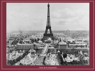 La Exposición Universal de París de 1900 celebró los avances tecnológicos y científicos del siglo XIX e inauguró el siglo XX. La exposición se llevó a cabo en varios lugares emblemáticos de París e incluyó pabellones de 58 países y novedades como el metro, proyecciones de películas y la iluminación eléctrica nocturna. Atrajo a más de 50 millones de visitantes durante su celebración de abril a noviembre.