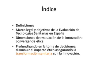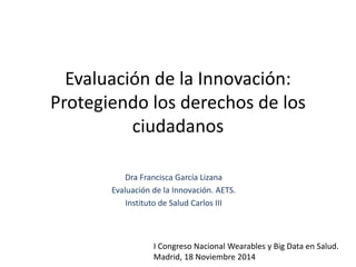 Este documento resume una presentación sobre la evaluación de la innovación tecnológica en el sector de la salud, con un enfoque en los wearables y big data. Explica que la evaluación debe considerar factores médicos, de seguridad, efectividad, costos, éticos, legales y de impacto social. También destaca la importancia de proteger los derechos de los pacientes, asegurar un uso apropiado de los recursos y reducir las desigualdades en salud al implementar nuevas tecnologías.