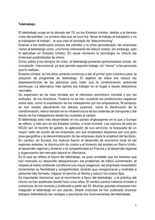 El teletrabajo surgió en la década de 1970 en Estados Unidos debido a la crisis del petróleo para reducir costos transportando el trabajo al trabajador en lugar del trabajador al trabajo. Ofrece beneficios como ahorro de costos, mayor flexibilidad y productividad para trabajadores y empresas. Aunque también plantea desafíos como aislamiento de los trabajadores, dificultad para cuantificar el trabajo y riesgos cibernéticos. El teletrabajo permite a personas con discapacidades físicas acceder a oport
