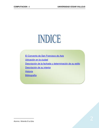 El Convento de San Francisco de Asis se encuentra ubicado en el Centro Histórico de Lima. Data del siglo XVI y su fachada es de estilo barroco limeño. Dentro alberga un museo, catacumbas y obras de arte. Fue reconstruido en el siglo XVII luego de un terremoto y es considerado uno de los principales centros culturales e históricos de la ciudad.