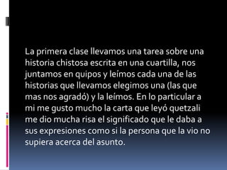 El resumen describe las actividades de una clase de lectura eficaz. Los estudiantes se dividieron en equipos y leyeron historias cortas que trajeron. Como castigo, los estudiantes que no trajeron la tarea hicieron lagartijas o compraron paletas. En otra clase, los equipos se dividieron un libro de lectura y contestaron preguntas sobre las secciones sin volver a ver el texto. Otro ejercicio involucró leer palabras y seleccionar aquellas de una lista previa.