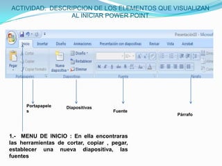 Este documento resume los elementos principales que se visualizan al iniciar Power Point 2007. Explica las 7 secciones principales del menú, incluyendo Insertar, Diseño, Animaciones, Presentación con Diapositivas, Revisar y Vista, y proporciona una breve descripción de las herramientas disponibles en cada sección, como insertar tablas, imágenes, diseñar diapositivas, agregar animaciones y sonido, y revisar la ortografía.