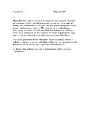 El documento ofrece una invitación a la amistad incondicional, prometiendo escuchar sin juzgar, acompañar física y emocionalmente, y compartir sin esperar nada a cambio más que una amistad sincera.