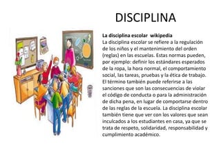 El documento habla sobre la disciplina escolar. Define la disciplina escolar como la regulación de los niños y el mantenimiento del orden a través de reglas en las escuelas. Estas reglas pueden definir expectativas sobre la ropa, horarios, comportamiento, tareas y ética de trabajo. La disciplina escolar también involucra las consecuencias por violar las reglas de la escuela y los valores que los estudiantes aprenden en casa como el respeto, la solidaridad y la responsabilidad.