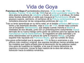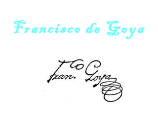 Francisco de Goya fue un pintor y grabador español del siglo XVIII que desarrolló un estilo innovador que inauguró el Romanticismo. Tras aprender en su Zamora natal y en Italia, se estableció en Madrid donde pintó cartones para tapices reales. Una enfermedad en 1793 le llevó a una pintura más creativa y original que reflejaba temas históricos como la Guerra de Independencia en obras como Los desastres de la guerra. Sus Pinturas negras en la Quinta del Sordo anticiparon el