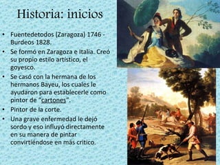 Francisco de Goya fue un pintor español que vivió entre 1746 y 1828. Se formó en Zaragoza e Italia y desarrolló su propio estilo artístico llamado "goyesco". Algunas de sus obras más importantes fueron Los cartones, La maja desnuda, La maja vestida y La familia de Carlos IV. Más tarde, una enfermedad le dejó sordo y su obra se volvió más crítica de la sociedad, como se ve en Los caprichos. Pasó sus últimos años exiliado en Francia, donde pint