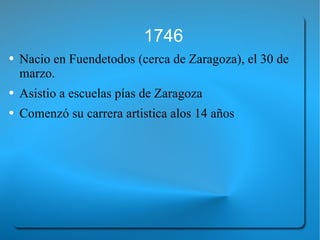 Francisco Goya (1746-1828) fue un pintor español que pasó la mayor parte de su carrera en la corte real española. Comenzó su carrera artística a los 14 años y viajó a Italia entre 1769-1771 para mejorar su técnica. En 1775 se instaló definitivamente en Madrid donde trabajó para la corte real. Más tarde documentó los horrores de la guerra de independencia española y la invasión francesa en una serie de grabados y pinturas. Aunque no tuvo herederos artísticos