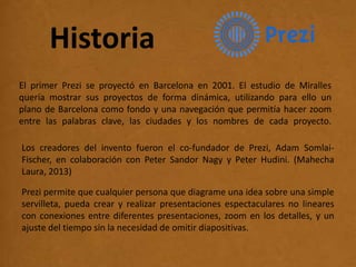 Prezi es una herramienta para crear presentaciones dinámicas de forma no lineal. Se desarrolló en 2001 y permite agregar texto, imágenes y videos para explicar ideas de manera interactiva mediante zoom, paneo y tránsitos entre elementos. El documento explica cómo crear una presentación en Prezi en 12 pasos, que incluyen registrarse, agregar contenido, editar la ruta y presentar la obra final.