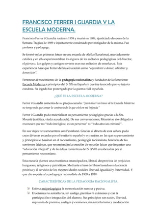 Francisco Ferrer i Guardia fundó la Escuela Moderna a principios del siglo XX en España para promover una educación laica, racionalista y emancipadora. La Escuela Moderna se basaba en principios como la enseñanza no autoritaria sin castigos ni exámenes, considerando al alumno como un participante activo en su propio aprendizaje a través de actividades prácticas y el desarrollo del espíritu crítico. Aunque tuvo éxito inicial, la Escuela Moderna y sus ideales pedagógicos racionalistas fueron repri