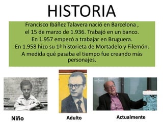 Este documento resume la vida y obra de Francisco Ibáñez, el creador de los populares cómics de Mortadelo y Filemón. Ibáñez nació en 1936 en Barcelona y comenzó a trabajar dibujando historietas en 1957. Sus personajes más famosos son Mortadelo y Filemón, agentes secretos de la TIA. El documento también describe a otros personajes secundarios recurrentes como El Super, Bacterio, Ofelia y Rompetechos. Finalmente, menciona otras series de cómics de Ibáñez como Pepe Gotera y