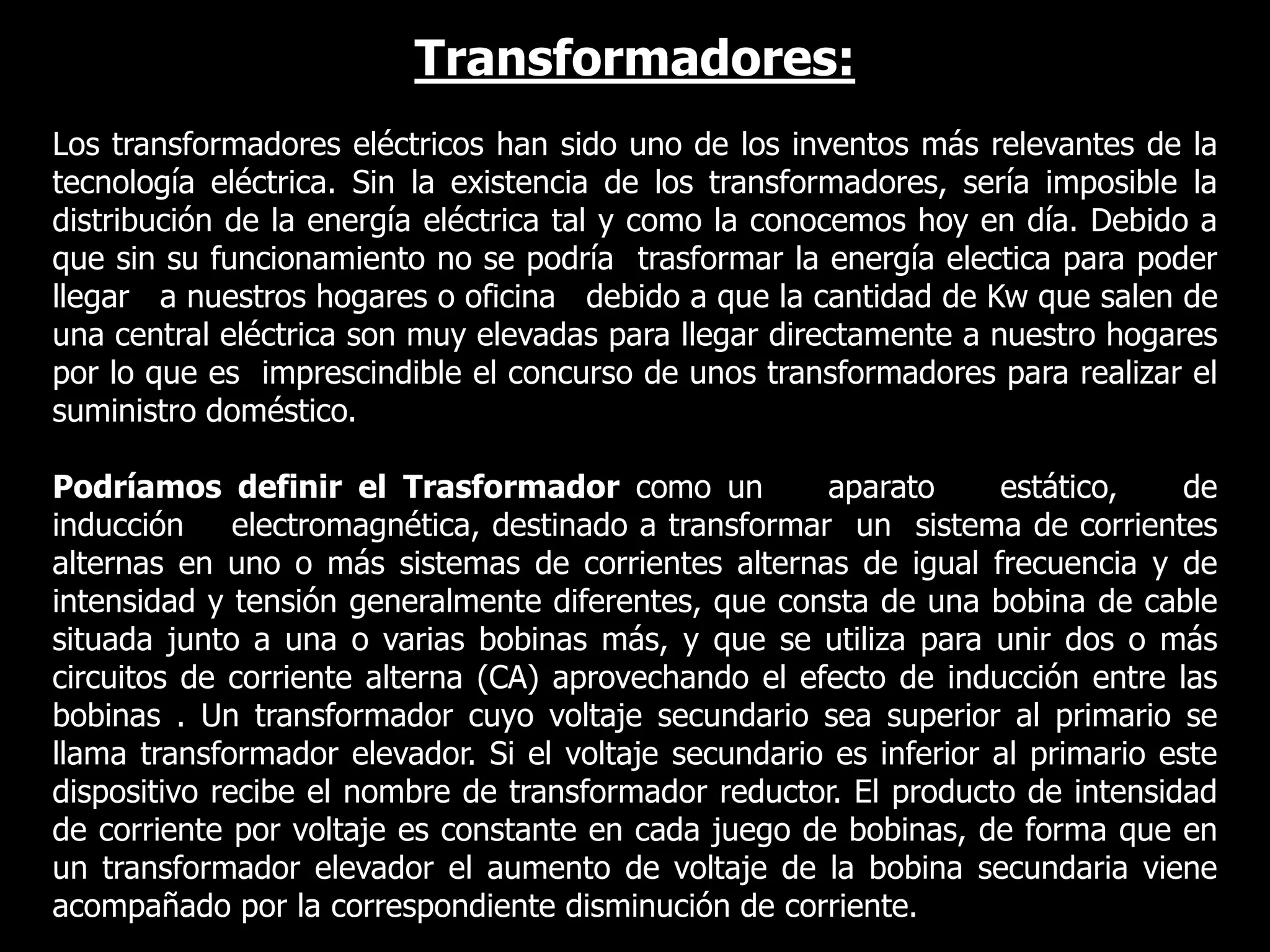 Este documento trata sobre transformadores eléctricos. Explica que los transformadores son indispensables para la distribución de energía eléctrica ya que permiten elevar o reducir los voltajes de corriente alterna. Luego define un transformador y describe sus características principales como el tipo de voltaje de salida. También discute las diferencias entre transformadores ideales y reales, así como conceptos como inductancia mutua y flujo magnético. Finalmente, incluye ejemplos y ecuaciones para calcular parámetros como pérdidas en el nú