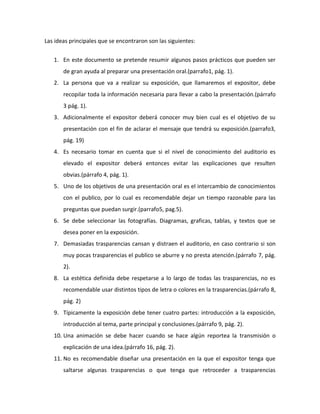Este documento resume los pasos para hacer una buena presentación oral, incluyendo la recopilación de información, preparación de diapositivas, ensayos y conocimiento del espacio. Explica que se debe recopilar información, preparar diapositivas claras con una estética consistente, practicar la presentación y familiarizarse con el espacio. El objetivo es entregar un mensaje claro y entretenido al público.